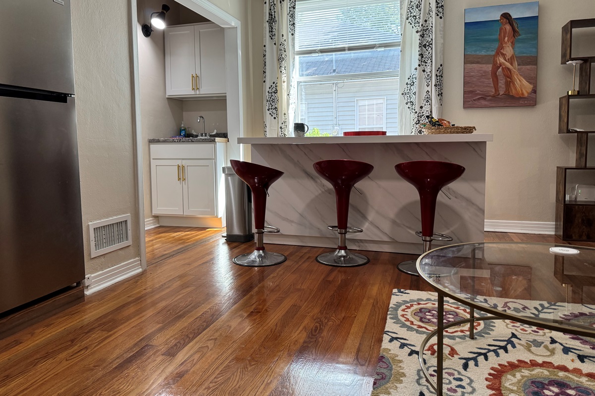 Pine floors in the main living area and vintage grey tile in the bathroom will give you a taste of old Tallahassee, while the comfortable living room and huge island and kitchenette will offer plenty of space to relax, work remotely,