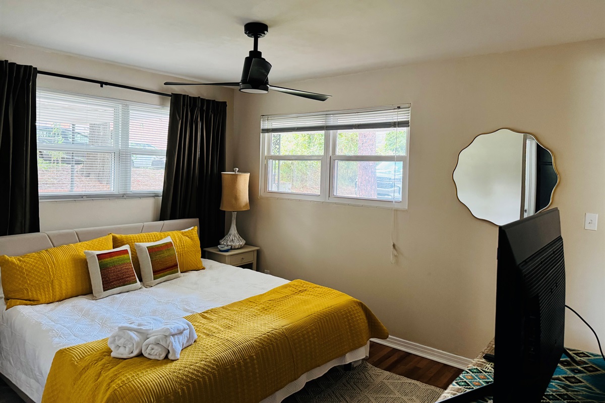 This quiet and comfortable king bedroom features top quality linens, mattress and a variety of pillow types so you can match your style. The room has a sleek and modern ceiling fan with a light, task lighting and our mascot, a fun, Fannie Flamingo light on the bedside table. We also have several nightlights to ensure you feel comfortable at night. The windows have both shades and blackout curtains so you can adjust the room’s lighting to your personal preference. There is a wireless charger for your phone, watch and iPods. A tv on the dresser will allow you to chill out after a day at work, sightseeing or visiting loved ones. We also keep a small but highly effective fan in the room for white noise/air flow if needed. Yes, we also have extra blankets. We want you to be comfortable!!! |